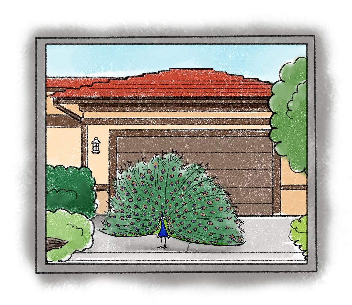 But currently, my parent’s neighborhood now boasts more peacocks than the Arboretum, due to a migration a few years ago! We visited my folks for Easter. Spring is mating season. It was both amusing and astonishing to see on their street that any driveway that did not contain a car, contained a peacock. A large, fully-plumed, male peacock. Strutting his stuff for the peahens and shaking his tail feathers. We always had at least one car in the driveway, except for one morning. And sure enough, there was he was, when we returned from the market. I was cracking up, watching those feathers shimmy in Mom’s rearview camera, as she backed in. My son was shouting out the window, “Peacock move!” He finally did. Less amusing are the sounds that they make. Occasionally, it is just a deep honk. But more often you hear cries of “Help! Help! Really loudly. I mean, really, really loudly! My poor parents; their AC went out due to a heat wave the other week. So they slept with the windows open. Guess what time the peacocks like to call out? Well basically any time of day, but especially around dawn… or earlier. I’m very grateful that the weather cooled off by the time we got there and we did not have to have our window open. Of course, I was so exhausted from traveling with two little kids that it probably would not have mattered!