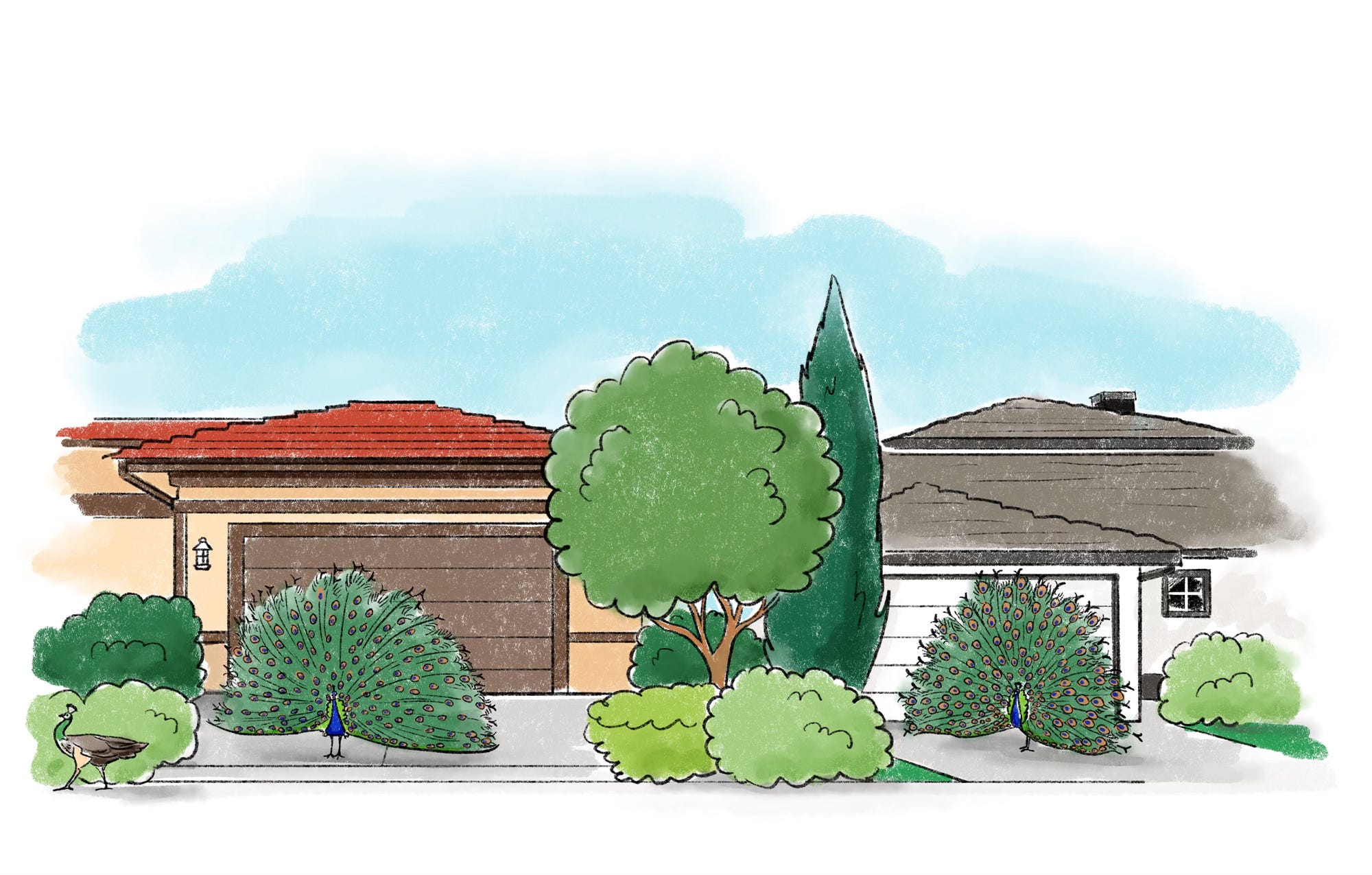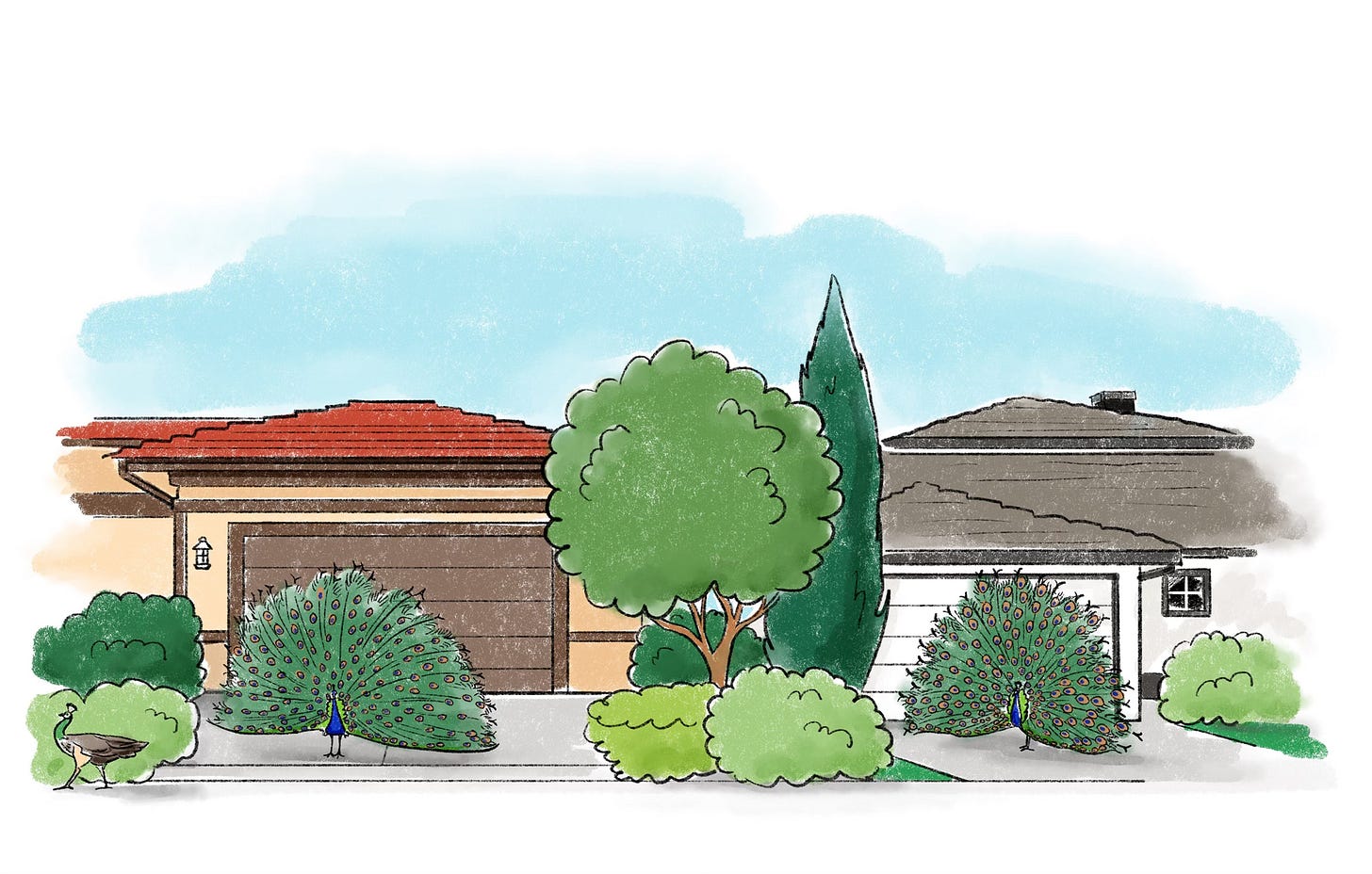 The India Blue peacock was imported to what became the LA County Arboretum by “Lucky” Baldwin around 1910. There was a neighborhood near the Arboretum in which I always wished I had lived in, growing up. Animals fascinated me, so the roving bands of peacocks there were thrilling to my young self. I recall after one visit to the Arboretum, I drew life-size peacocks in crayon on butcher paper and taped them around my backyard. You see, my neighborhood was nearby, but not quite close enough to have live birds nestled on my lawn. How things have changed, and how my opinion of peacocks has changed! Of course, I still think they are beautiful birds. My artistic sensibilities cannot help but admire the ultramarine feathers on the neck of the male peacock, followed by a cascading wave of emerald green with gold eyes.