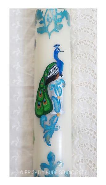 I suppose it was fitting to see peacocks around and about at Easter time, as the peacock is a Christian symbol. Ancient people believed that their flesh was incorruptible, and the annual shedding and regrowing of the male peacock’s feathers (and them becoming brighter and more brilliant each year), represented resurrection. When I was painting Pascal candles years ago, I even painted a peacock on one of them! It’s a beautiful bird, lovely plumage- almost like a Norwegian Blue.